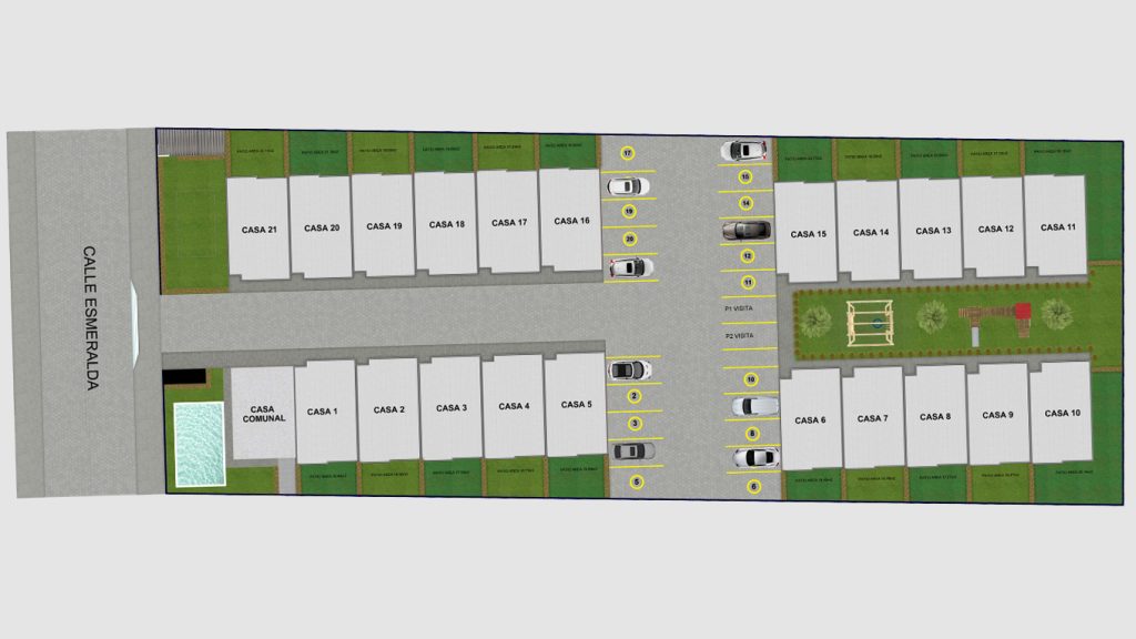 21 estacionamientos comunales, 2 para visitas y depósito de basura.