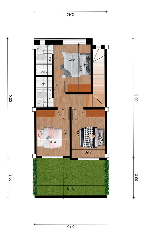 Planta alta: dormitorio máster, dos dormitorios adicionales y un baño completo.