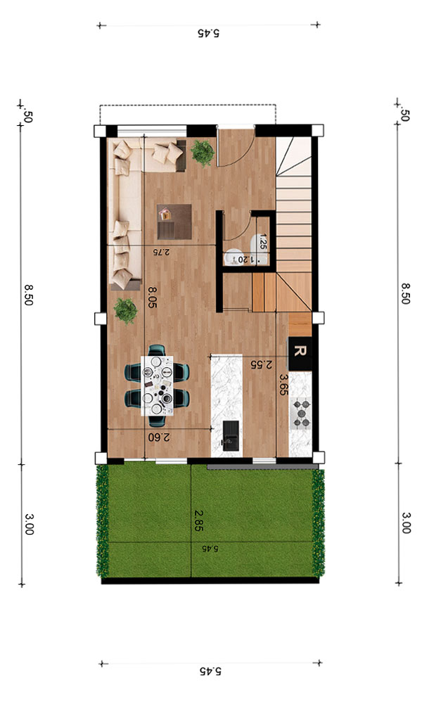 Planta baja: sala, comedor, cocina, baño social y patio posterior.
